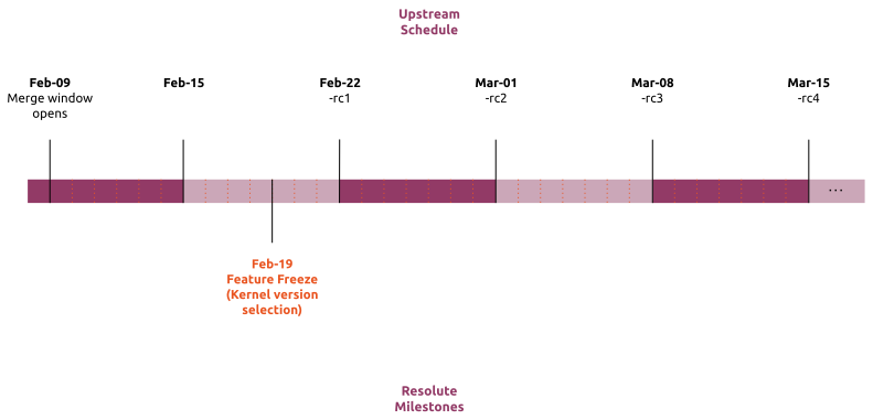 | February 19 | WW08 | Feature Freeze | Upstream kernel must be in an -rc or open merge window |