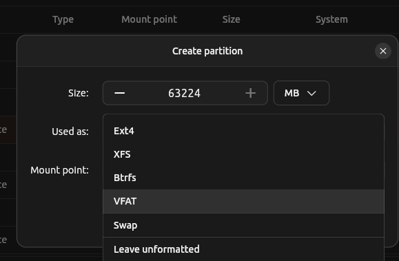 - Focus any dropdown menu (filesystem type, mount point, size unit, disk selection)