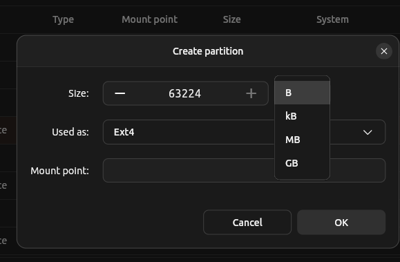 - The unit selector for partition size (MB, GB, etc.)