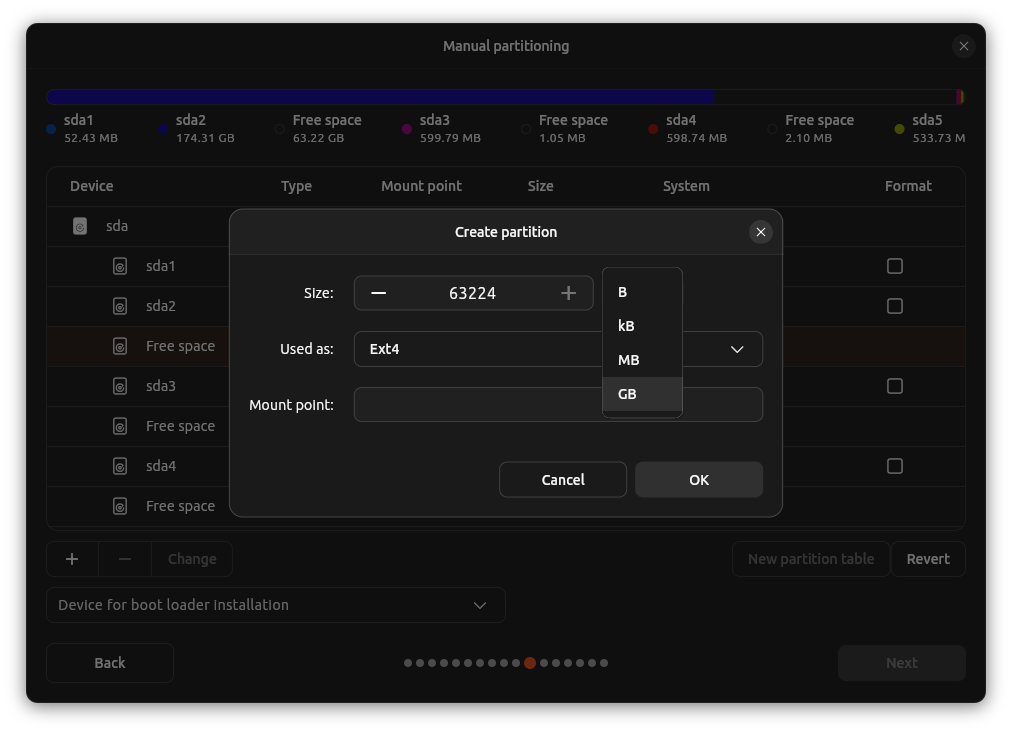 - The mount point selector (/, /home, swap, etc.)