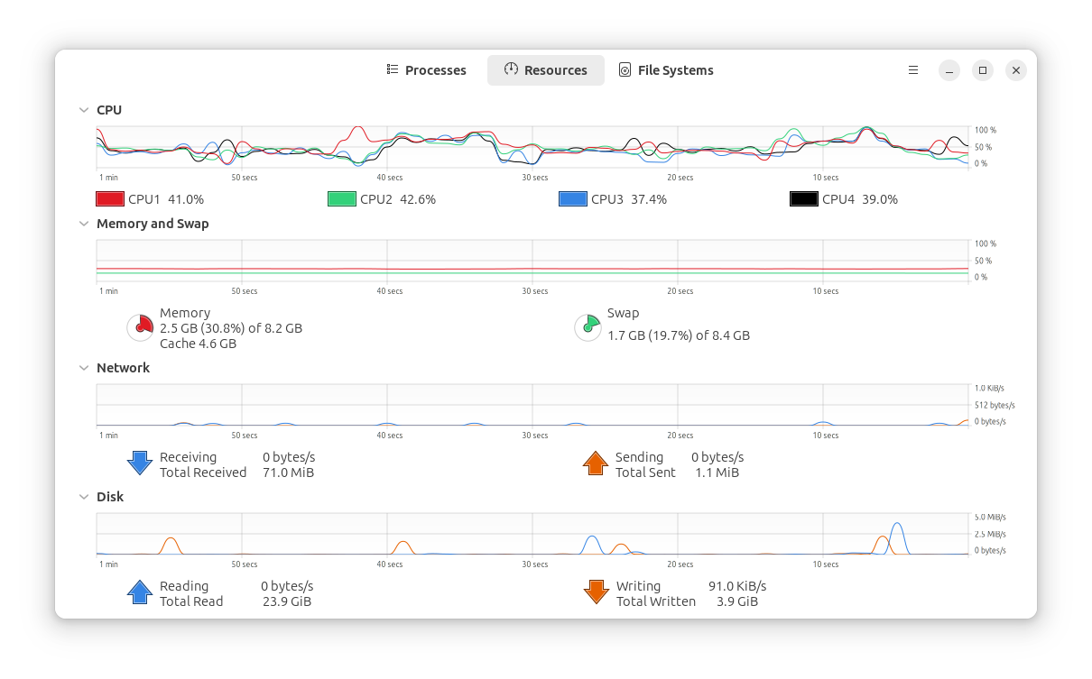 I use other tools (which also will consume some CPU. My favourite is something like btop or dool in a terminal.