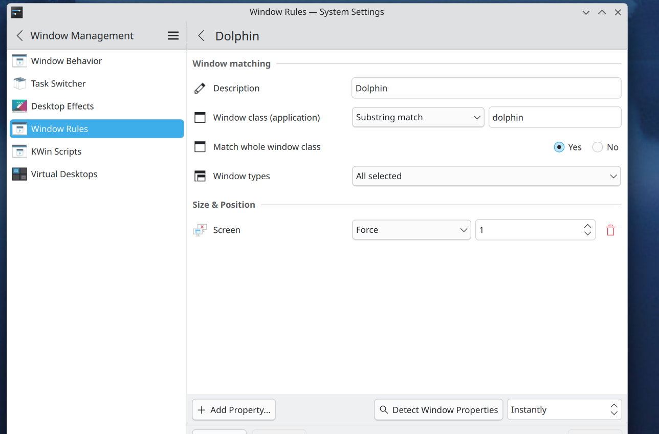 As for the screen property - this doesn’t do anything I can see, the screen number is not connected to anything I can see. Except for a future time when window rules can understand multi-monitor setups, this does nothing. If I’m wrong please someone correct me.