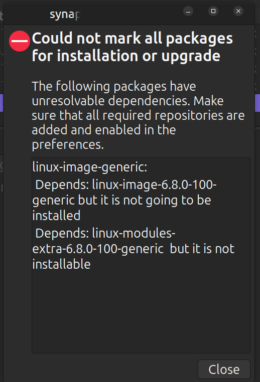 So I then opened Synaptic and searched linux-image-generic and scrolled down and found the 6.8.0-100 kernel and clicked on it and was given all the usual options plus the option to Mark for Upgrade and did so and applied it and received this: