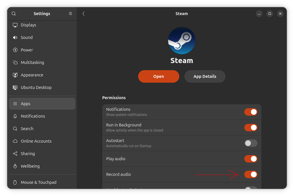 On both kde plasma and gnome you can go into settings , applications and search for steam and enable the record audio permission.