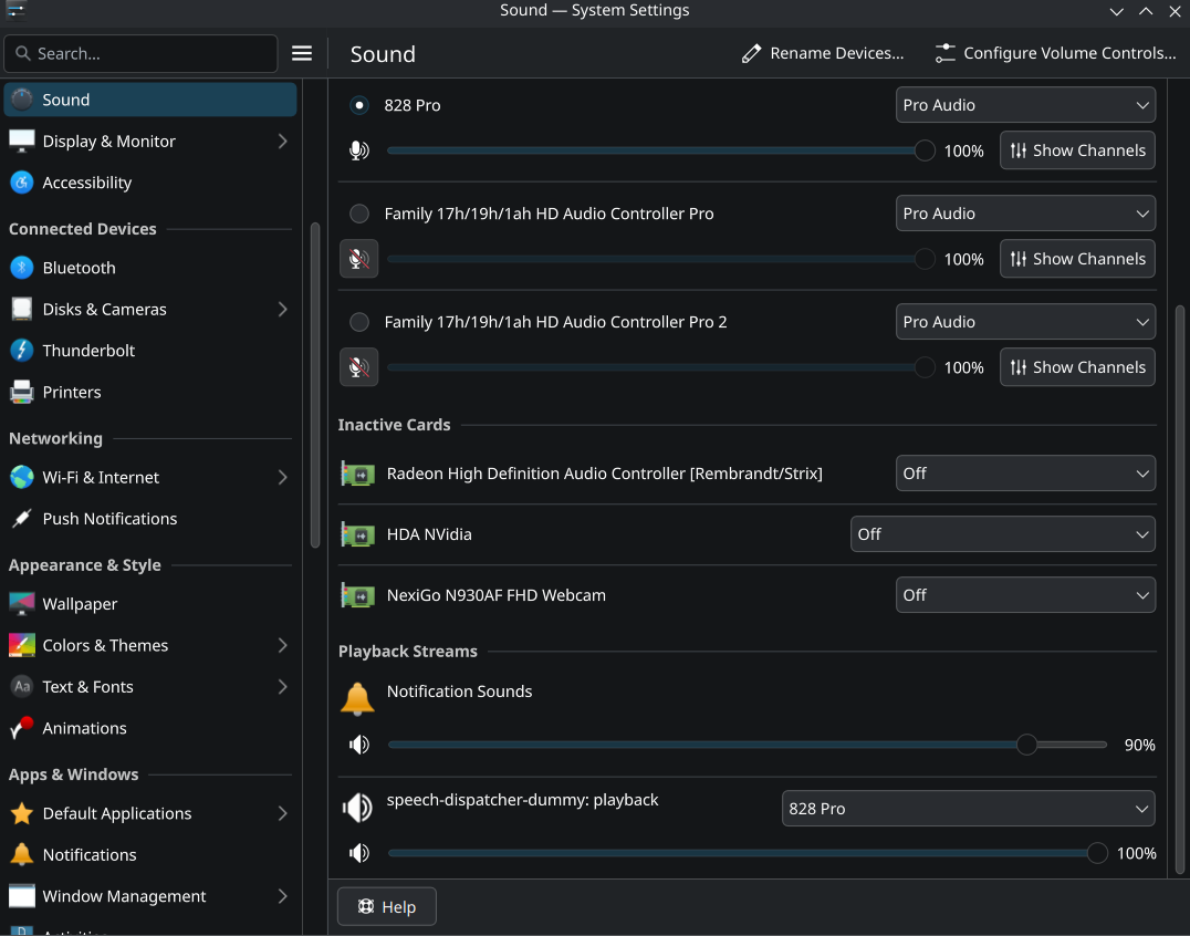 Here’s what it should look like when I have the HD Audio Controller selected as my default playback device (It’s being sent to the 828 Pro as I swapped it from the HD Audio Controller to my audio interface, which it now does by default, but ONLY when the HD Audio controller is selected as the default playback device)