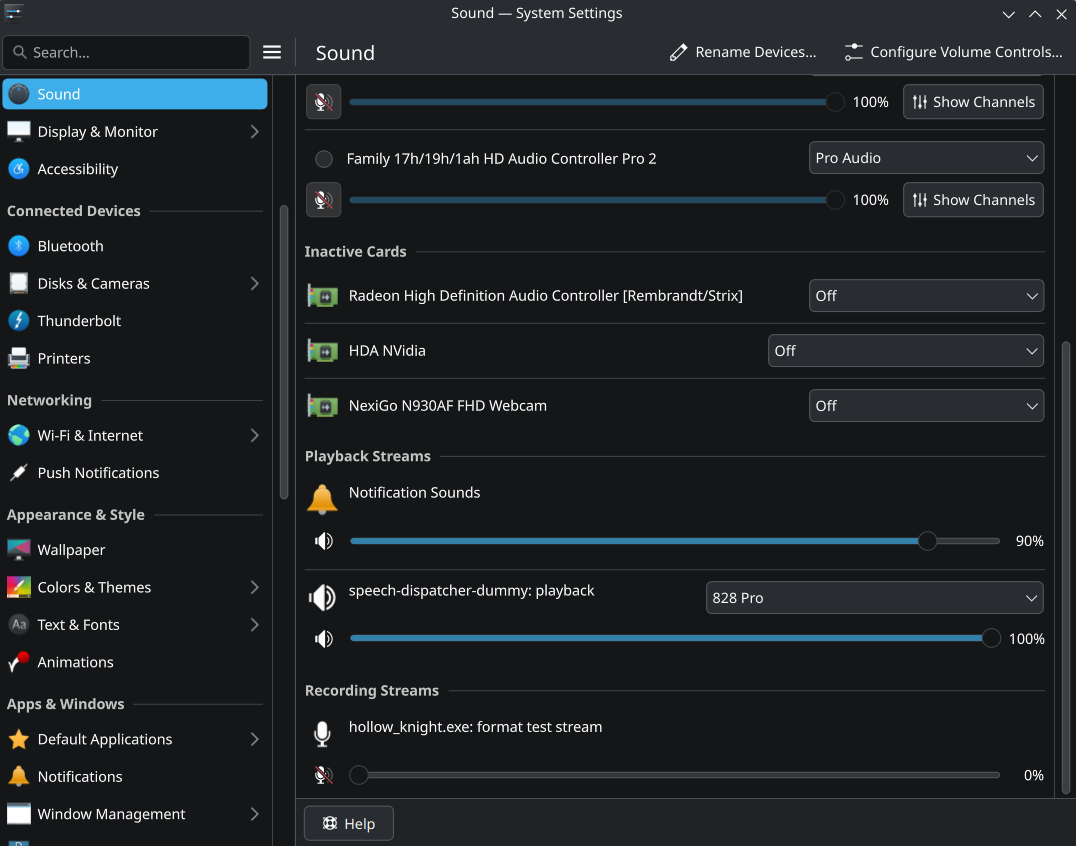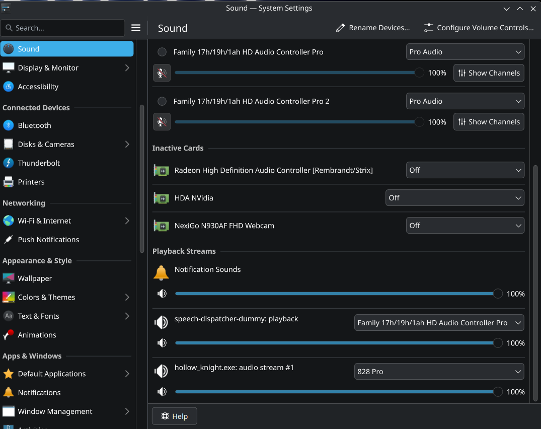 However, when I launch any game on Steam, the audio stream for the application is created in the sound manager, but paused and at zero output. Once the game fully opens (the application launches the window to the menu), the audio stream completely disappears and no audio is heard from in the game (this occurs with any game I launch via Steam, namely Hollow Knight and Deadlock as examples). I’ve confirmed this by checking audio sources via Helvum and there is no audio stream being sent to my outputs from these games.