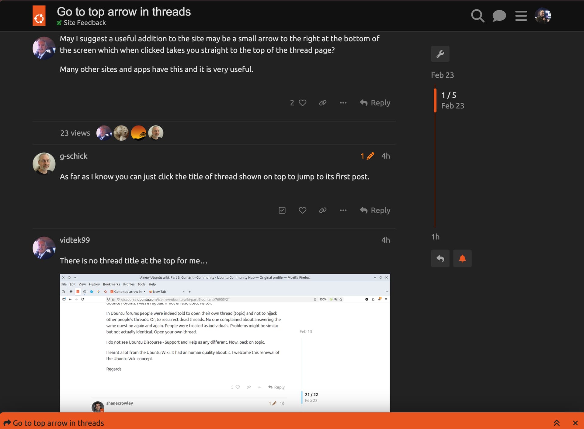 Here’s a video where I visit the same thread in default (light) and dark mode. Note how in light mode the whole header bar just moves up, whereas in dark mode it’s pinned to the top of the page, and the title of the thread moves up there.
