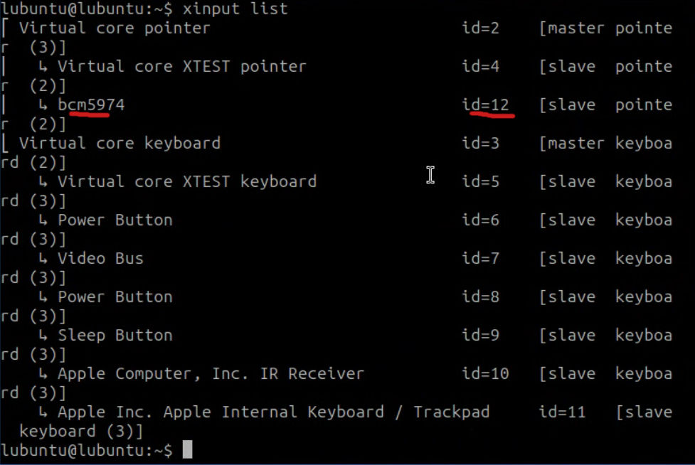 Put xinput list into the terminal. This will show you a list of input devices connected to your computer. Your Mac’s trackpad will likely have the charming name bcm5974. On the right of the terminal you can see the ID for each device. My bcm5974 has the ID 12.