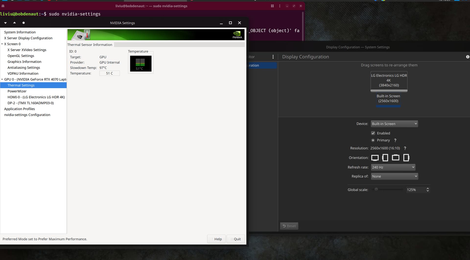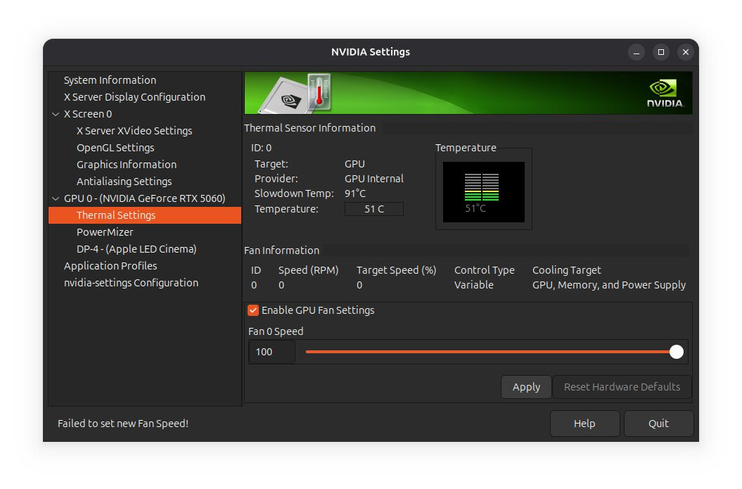 sudo nvidia-settingson a terminal and change your fan speed if you want (Please note the rebooting will reset the fan speed) -