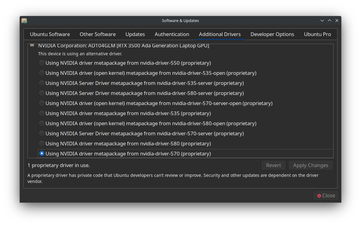 Try the Nvidia 580-open driver. At some point, the “-open” is required on the newer GPUs, but not sure it that applies to just the 5xxx series or includes the 4xxx to (4070TI equivalent I think to your RTX 3500). How did you install the current driver? I find switching from the Additonal Drivers tab like you show should be seamless, but a third party source for drivers may cause problems. What version of CUDA are you interested in? the CUDA 13.0 requires the 580 driver to run the samples.