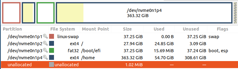 └─nvme0n1p4 363.3G ext4 /dev/nvme0n1p4 /home