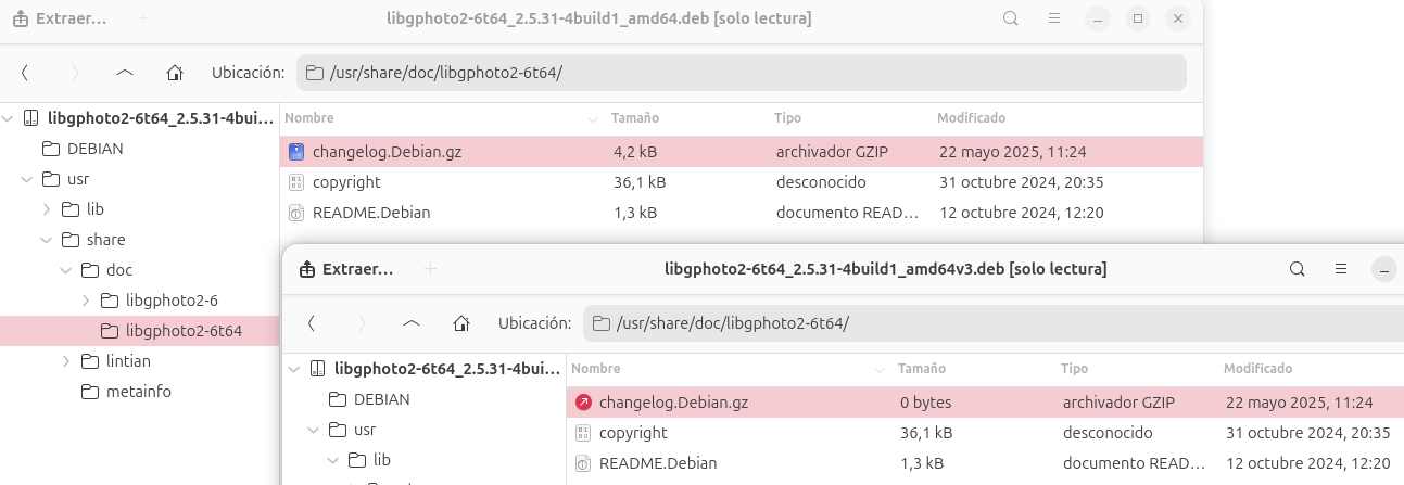 So what I think has happened here (and similar for the librsvg2-common issue other people have reported) is that you have libgphoto2-6t64:i386 installed and because of how we did the amd64v3 builds this was built a long time before the amd64v3 package and for some reason the changelog compressed differently. This wonât be a problem in 26.04 because we will rebuild all packages in the usual way and this wonât happen again.