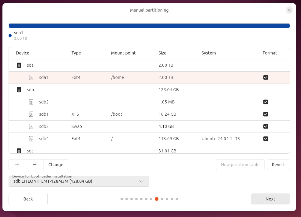 I didn’t create the /dev/sdb2 partition but I assume it came about by clicking the “device for the bootloader instalation”.
