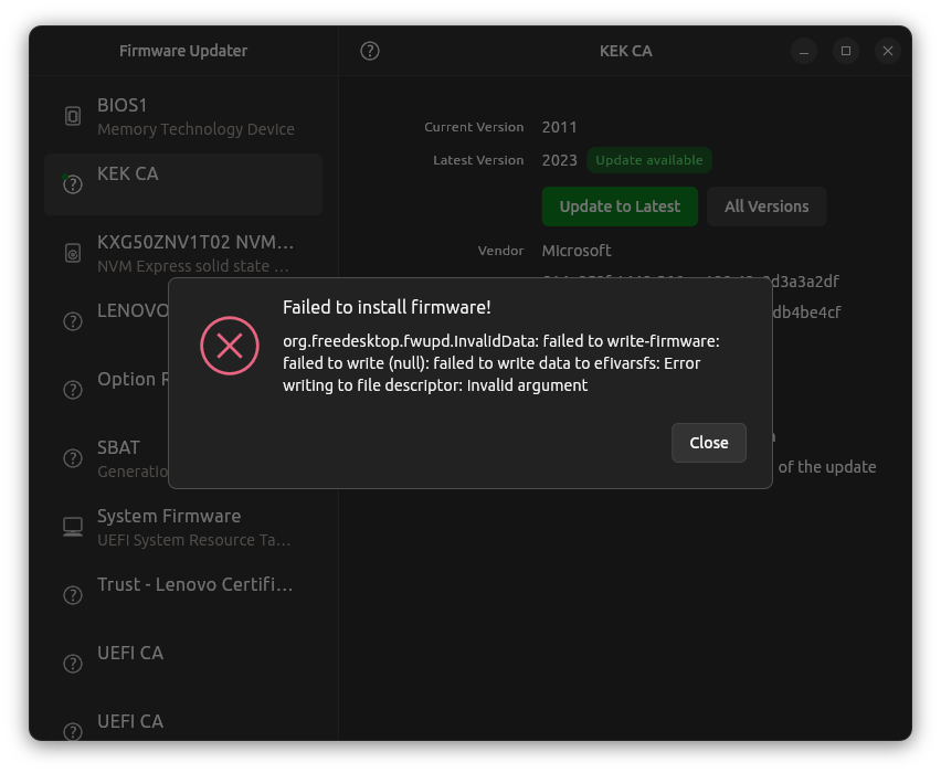 failed to write-firmware: failed to write (null): failed to write data to efivarsfs: Error writing to file descriptor: Invalid argument