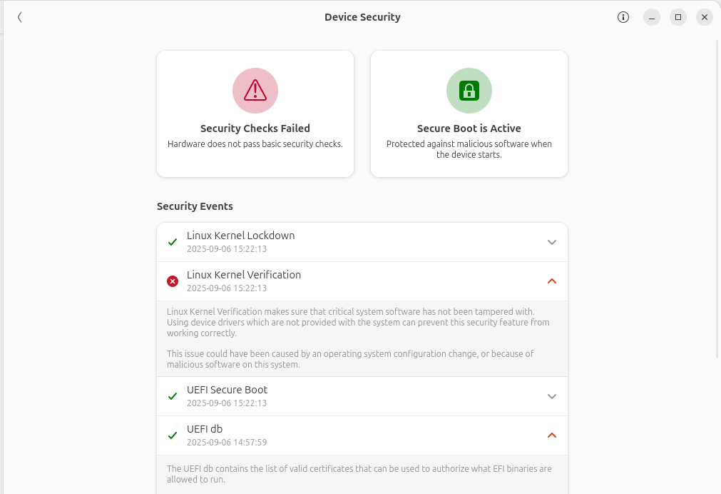 Hi. bought a new desktop with a ASRock B760M Pro RS/D4 and a 12th Gen Intel® Core™ i9-12900KF × 24 CPU, however after transferring my hard drive to my new desktop,nearly all hardware security checks which I have listed at the end of this topic. It seems that I contacted ASRock over this and they recommended reinstalling the operating system which I did, but the results are the same. Seems that ASRock recommended that I contact Ubuntu directly which brings me here. Most troubling of the settings seems that the motherboard is in manufacturing mode which really creeps me out. Is there a conflict between the motherboard and Ubuntu? Let me know if you have any ideas or need more details. I’ll provide what I canwith the latter.