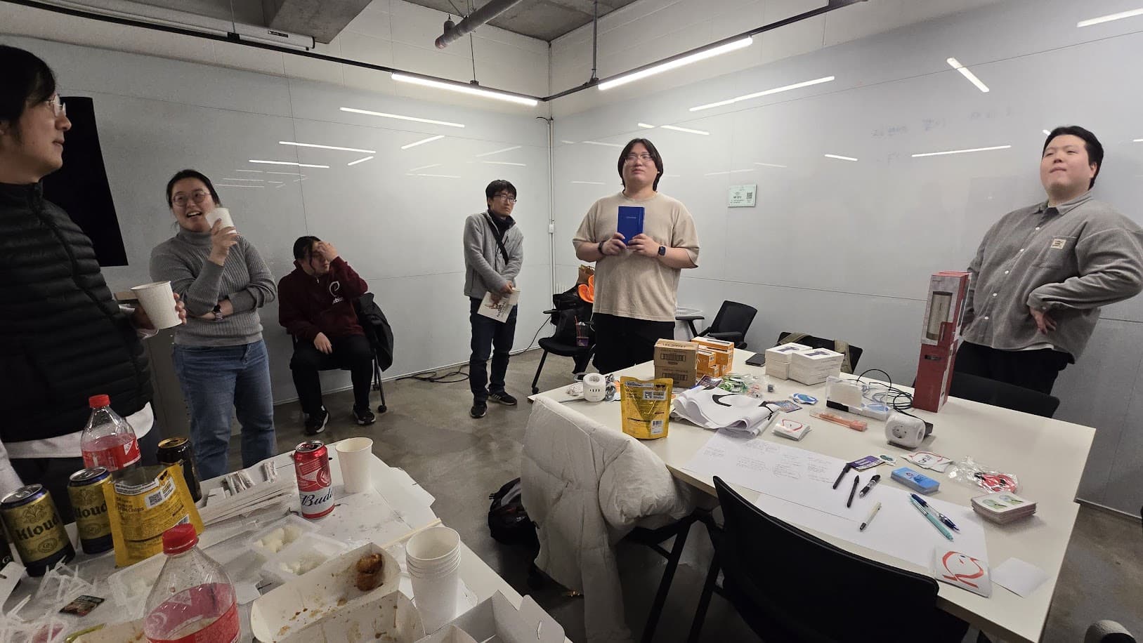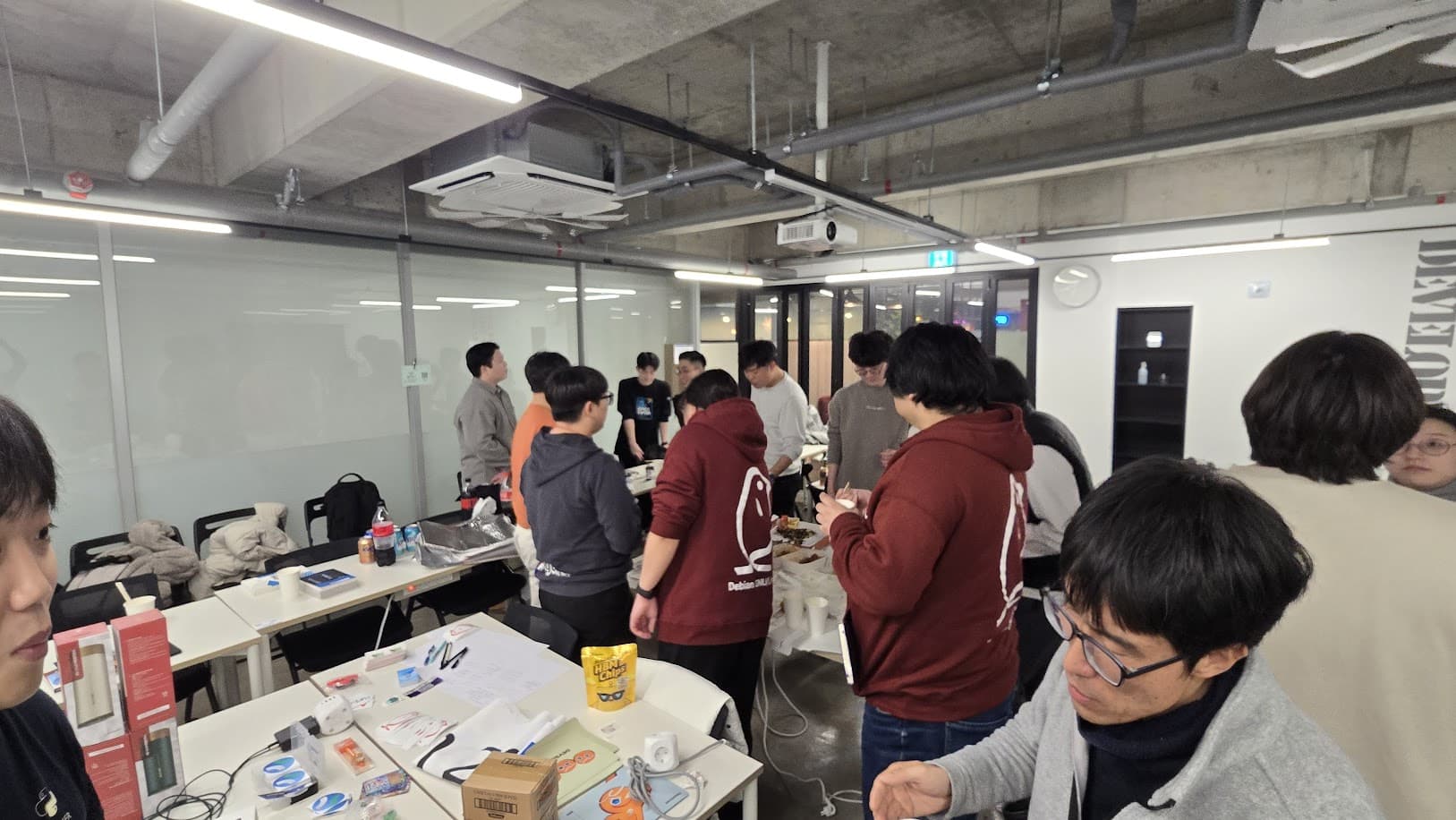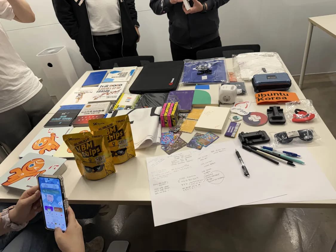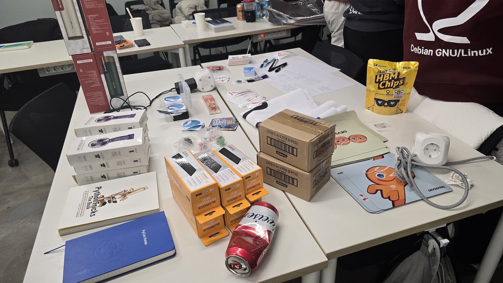 After presenting each communities’ activities and plans, We had some time to share some foods and also giveaway stuff each participant brought from their home. Such as some books, Handheld fans, Ubuntu Caps, PyCon KR Diary and also a large MiniDebConf Busan banner(?) from @zeroday0619