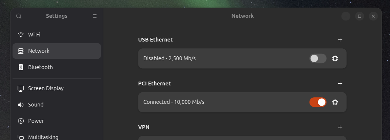 So I feel like the UI is hiding some interface abstraction layer from me. It is treating all wired interfaces as one somewhere under the hood and yet presenting them as separate with their own toggles and config gear icons. If it shows independent on/off toggles, it should allow independent on/off. Different settings buttons, different settings. Either the GUI needs a redesign that makes it clear that you can’t do this (a radio button to choose one out of a list if interfaces to enable and a single gear icon for the currently selected “Wired Network”), or it should support what it seems designed to.