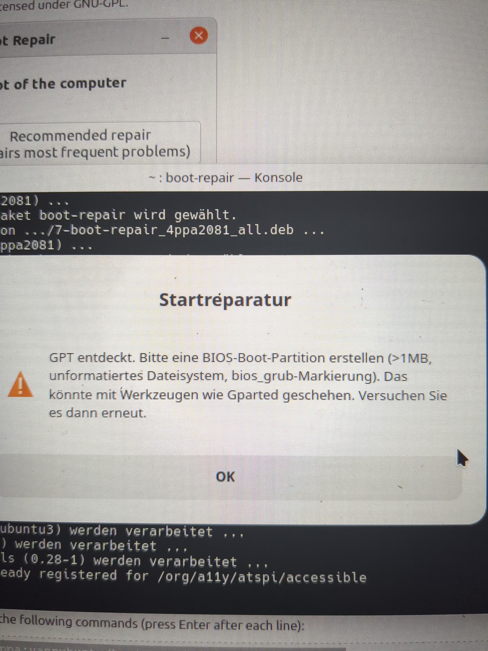 “GPT detected. Please create a BIOS boot partition (>1 MB, unformatted, with bios-GRUB flag). This can be done with tools like Gparted. Then try again.”