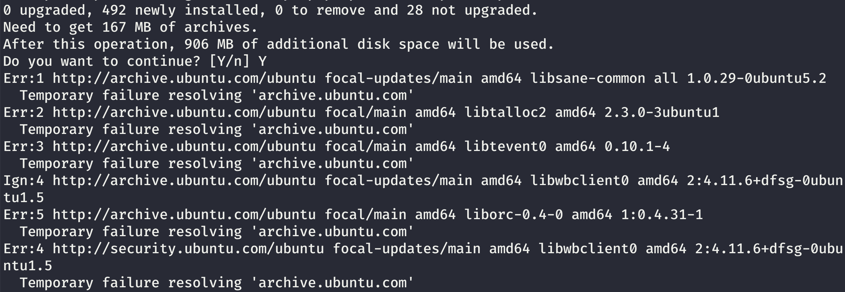 Hi @okada-shin, those errors are unrelated to the packages being installed, you seem to be having networking problems from within the instance. Did you see our troubleshooting guides (macOS, Windows)?