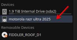 When I connect my Motorola 53G 5G mobile phone I immediately get a notification on the phone’s screen, not on the computer, asking if I want to use file transfer or video and photo transfer which sound very similar but I assume the video and photo transfer is the mtp protocol and the file transfer is simple usb mass storage though that is not made clear in the notification.