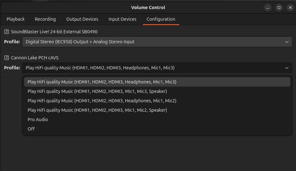 I hope you agree that the available “profiles” make little sense (and that the IEC958 (S/PDIF) outputs have no reason to be limited to stereo as in the list )