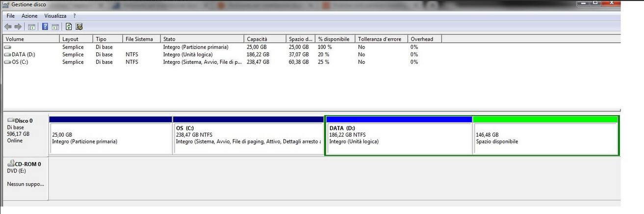From Windows 7, I shrunk my D:\ partition, and the remaining free space was not listed as NTFS, but as 150 GB of “available space.”