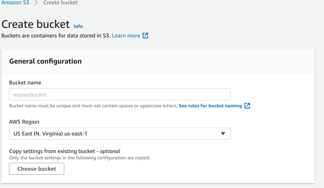 Enter a name for your bucket, pick an AWS Region (choose the nearest to you, as you will run the instance in the same region for getting better latency).