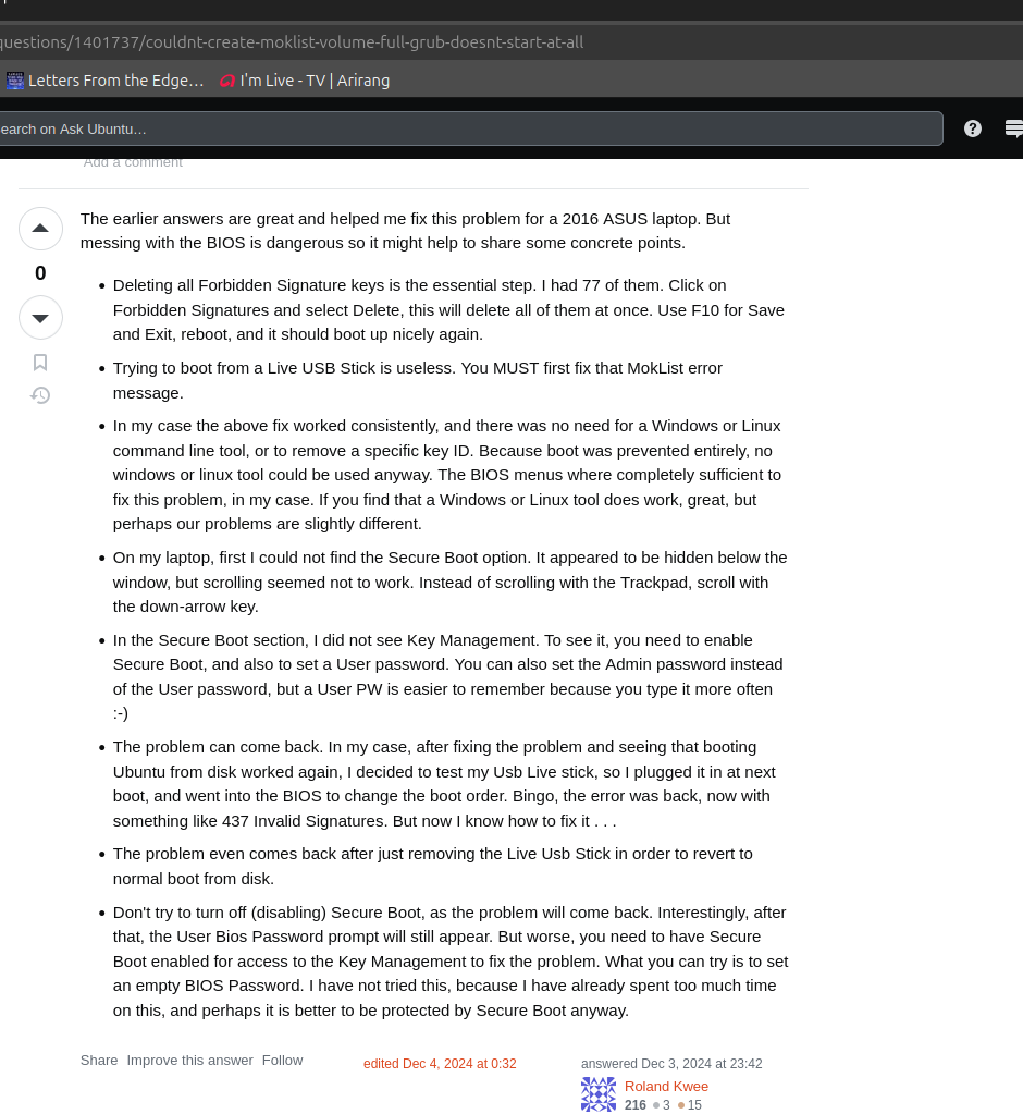 So, maybe that Forbidden or Revocation List doesn’t matter especially since I now have secure boot disabled? Then I need to look for another reason, but is having that many in the list a problem or should I update it as stated in that article?