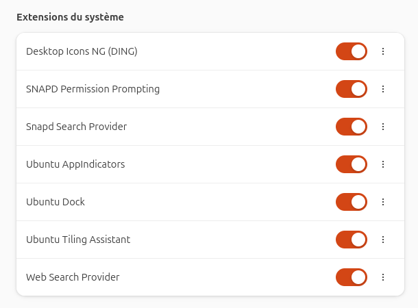 I am writing this on Ubuntu 24.04 LTS. I look in /usr/share/gnome-shell/extensions and I see folders for Ding; tiling-assistant; ubuntu-appindicators and ubuntu-dock.