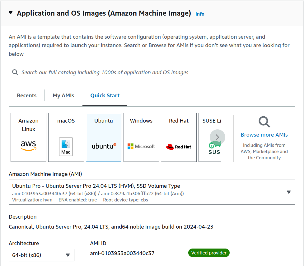 In the EC2 console, select “Launch Instance”. Under “Application and OS images” select the Ubuntu Family, where a dropdown menu will appear with Ubuntu server 24.04 LTS and Ubuntu Pro 24.04.