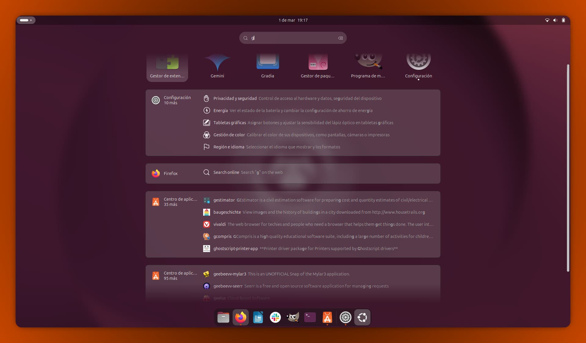 App Center is in spanish; what isn’t in spanish are the Snap descriptions. I don’t mind seeing them in english within the App Center, but it feels weird in the GNOME search bar.