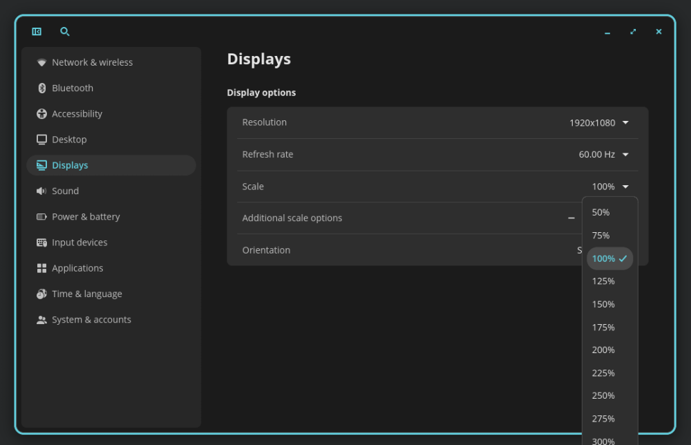 Well, now Display settings is working again and I’m waiting for 50% and 75% scale options like in Cosmic desktop. For those with good eyesight and a 27" 1920x1080 monitor, scaling at 75% makes a 2560x1440 monitor which is still very readable on 27"