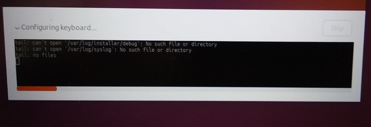 I tried different methods for burning but no new partition on the USB after failure. No log files to see. This is the last thing Ubiquity showed at the crash.