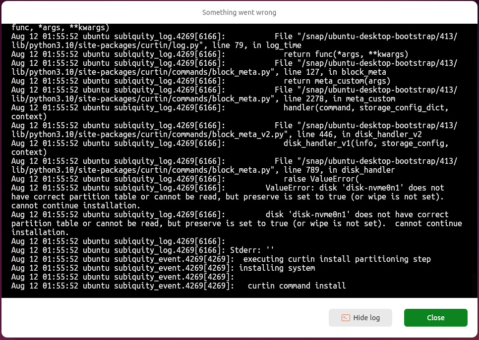 Problem Description: Unable to install Ubuntu alongside Windows 11. When I select “Something Else” (manual installation) in the installer, my NVMe SSD is detected but shows as 0 Bytes in size. This prevents me from creating partitions or proceeding with installation.