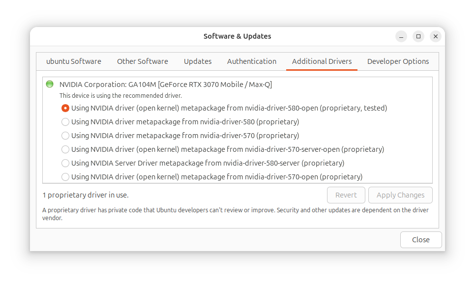 With that in mind and if your gpu is supported, you may want to consider installing the 580 version on 25.04 prior to upgrading to 25.10 and that way you won’t have to deal with any “foreign package” warnings.
