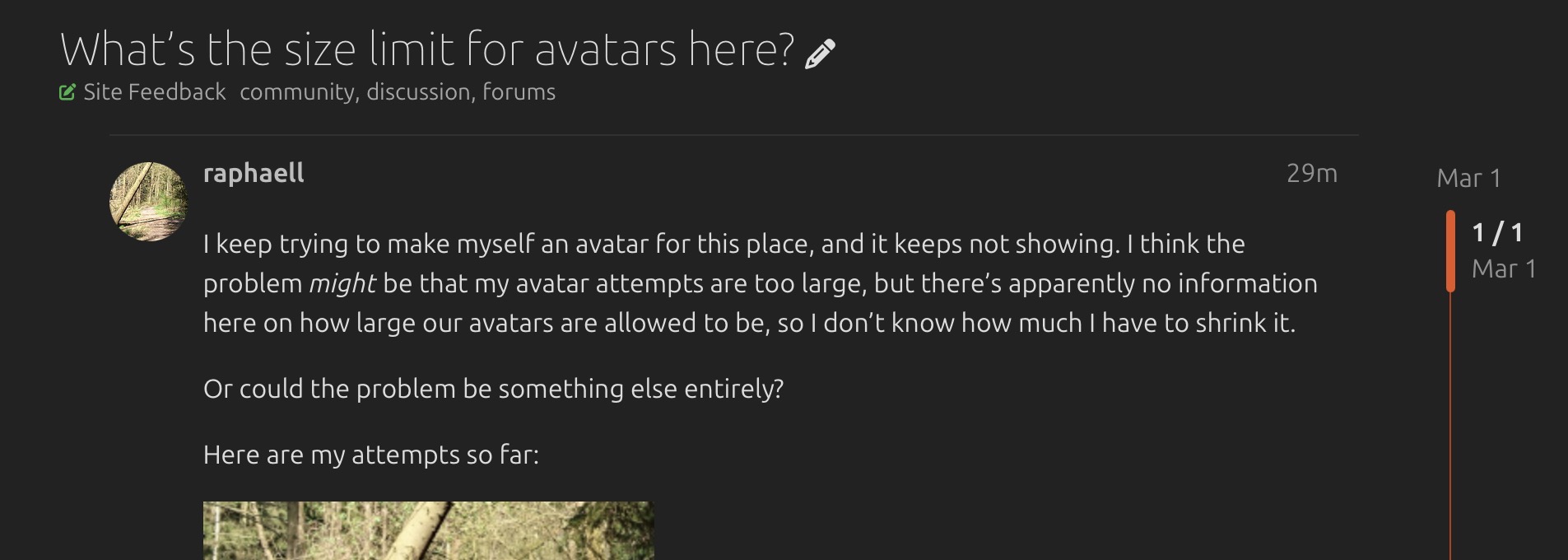 I keep trying to make myself an avatar for this place, and it keeps not showing. I think the problem might be that my avatar attempts are too large, but there’s apparently no information here on how large our avatars are allowed to be, so I don’t know how much I have to shrink it.