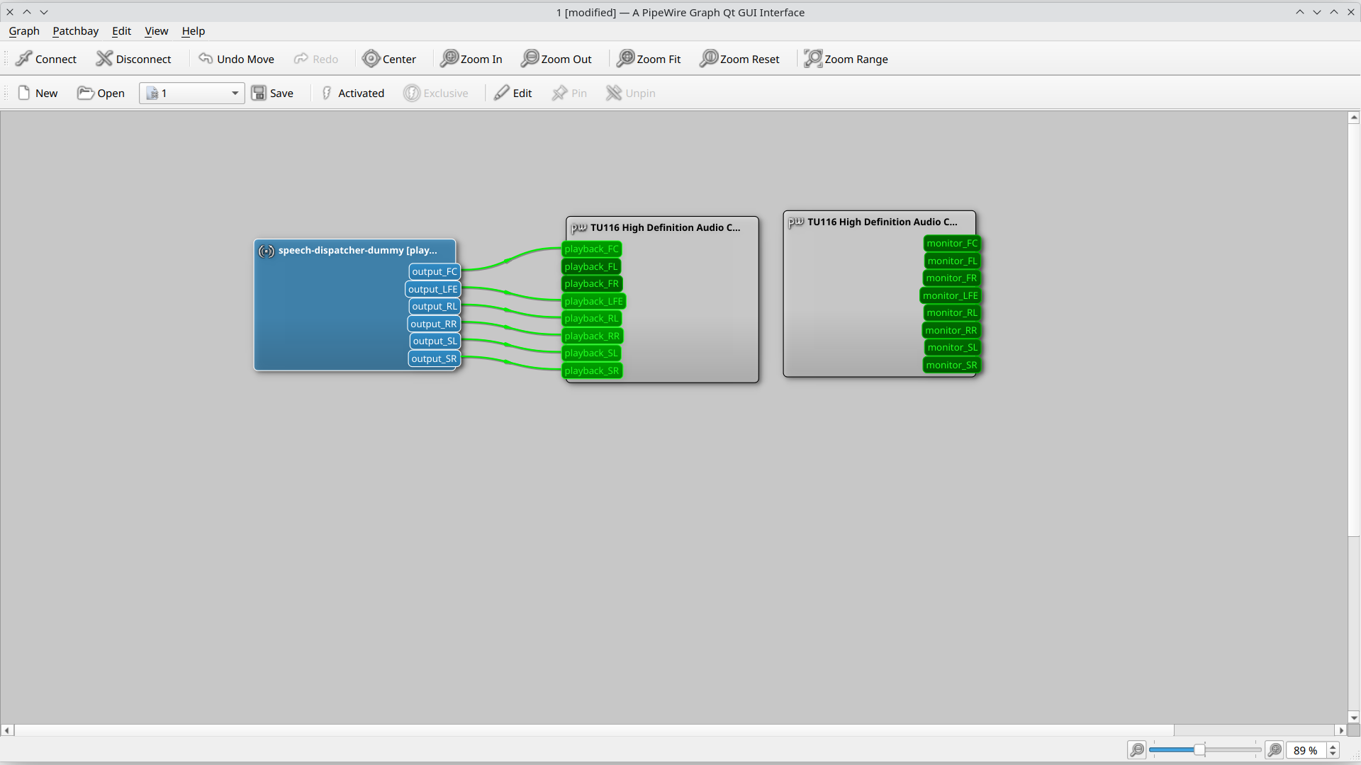 Open the monitor speakers and add the path graphically to the speakers via Helvum